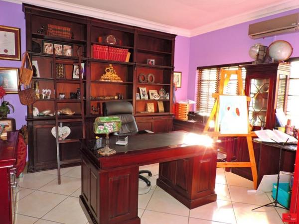 family room with easy access from the semi-open plan kitchen with walk in pantry. The spacious kitchen has a modern feel to it with ample cupboard and appliance space, a breakfast nook and a separate scullery. You will also find a spacious en-suite guest room downstairs, an additional guest bathroom and a study. Upstairs