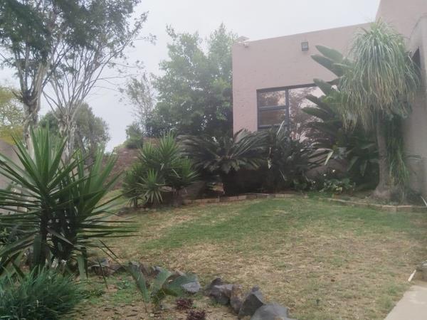 Entertainment area with built-in braai, overlooking a beautifully maintained garden and sparkling pool perfect for hosting guests.