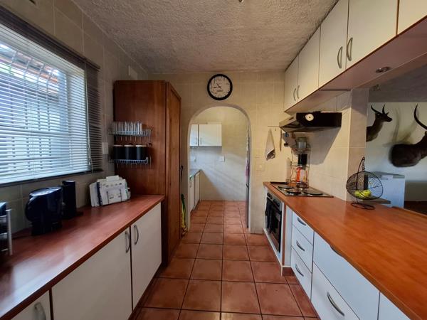 Gorgeous kitchen with white cupboards, wood-look countertops, electric stove, oven & extractor, plus a separate scullery/laundry