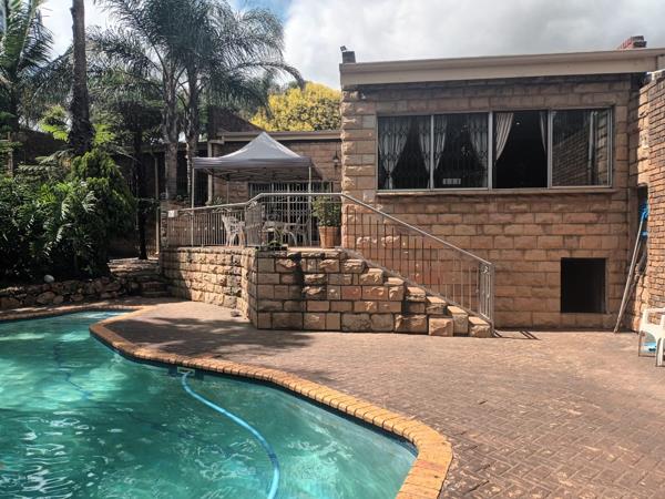 Kitchen with sleeper cabinets and separate scullery / laundry. Store room and 2 outside rooms with bathroom. Pool area and 4 garages with direct access into home. Beautiful and established garden. Pet friendly. Close to schools and shopping centers.