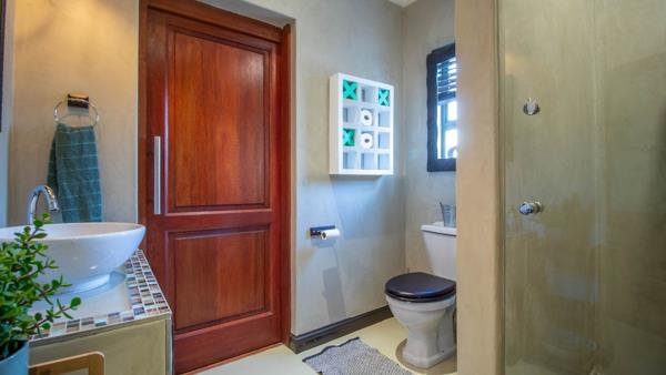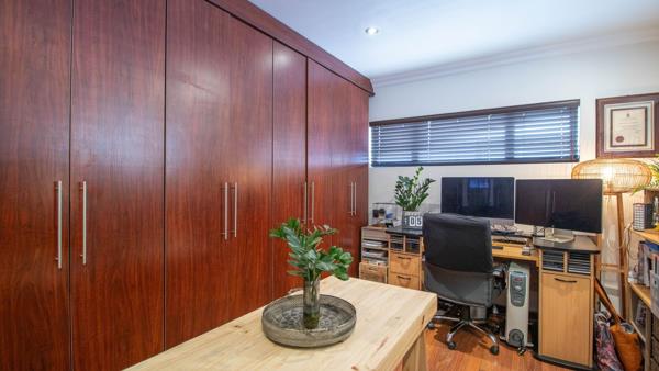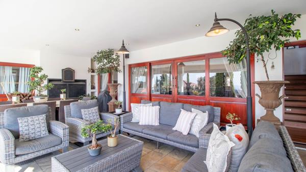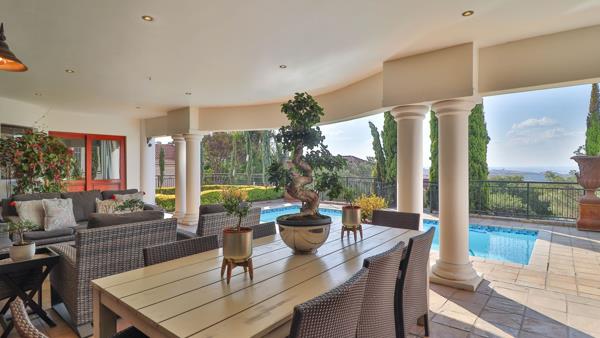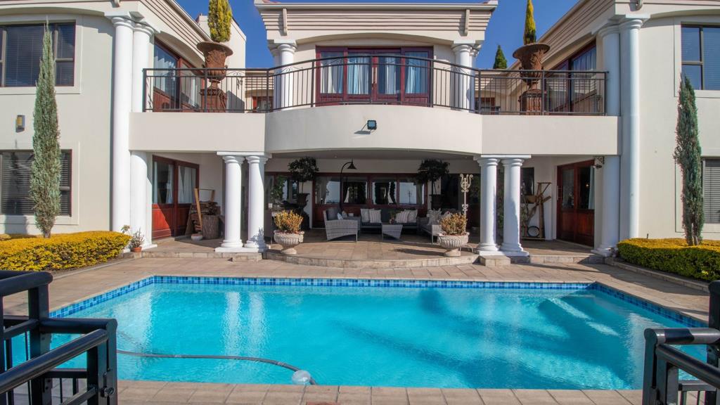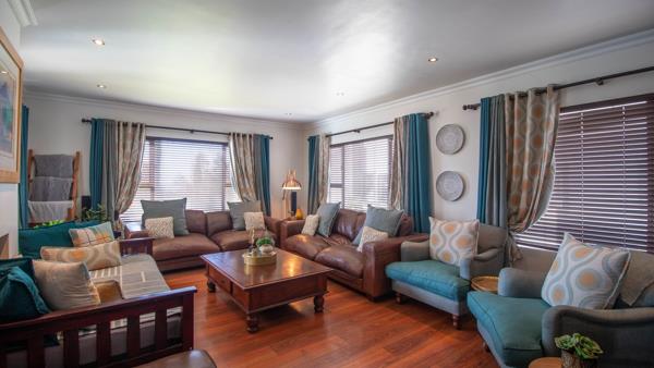 The 3 living areas flow seamlessly with a warm gas fireplace in the one lounge, while triple patio doors open from three sections of the home, inviting you to the expansive outdoor patio, perfect for entertaining. Enjoy year-round gatherings with a built-in braai and gas braai, overlooking a sparkling swimming pool and an evergreen, low-maintenance garden nourished by an automated irrigation system, borehole, and JoJo tank.