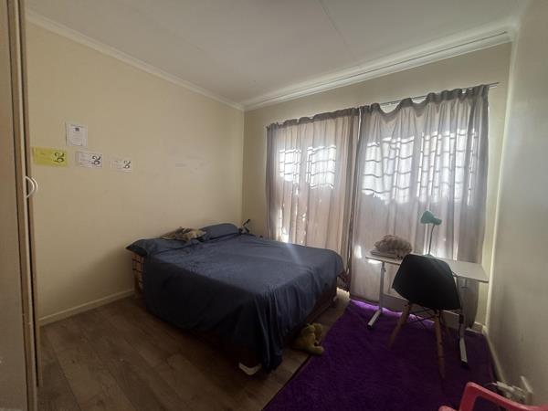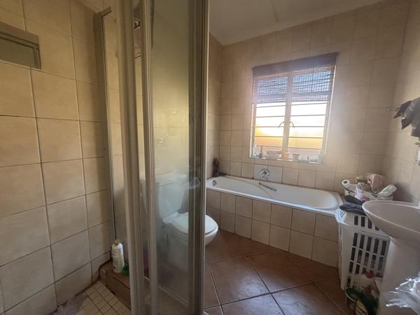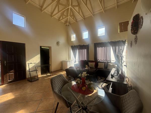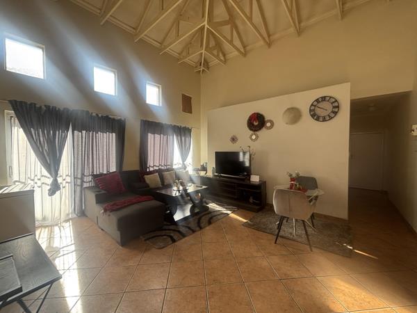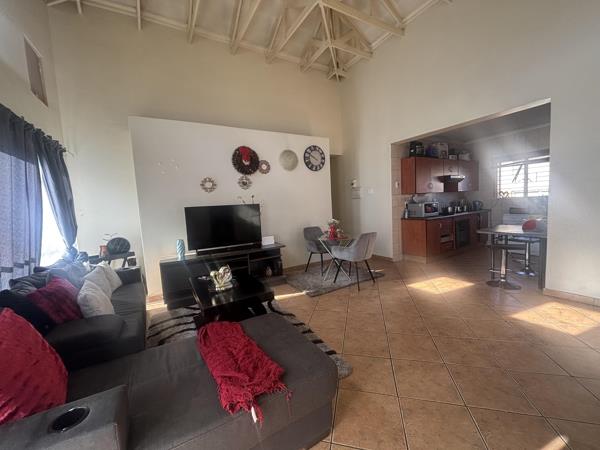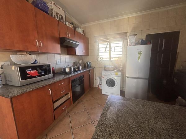 This generously sized townhouse is located in a highly desirable complex. It features a spacious open-plan living area that includes a cherry wood kitchen, offering ample cupboard space.