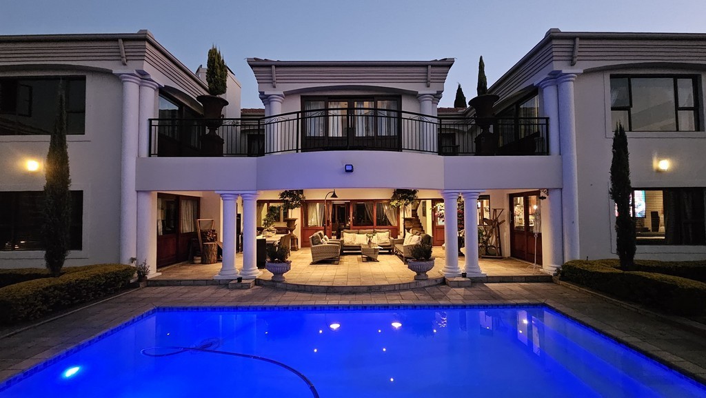 Three expansive living areas flow into a cozy lounge featuring a gas fireplace. Large glass doors open onto a generous, covered entertainment patio with a built-in braaiperfectly positioned alongside a sparkling swimming pool and a landscaped garden supported by a fully automated irrigation system. The property is further enhanced by a borehole and JoJo tanks, serving as reliable backup water systems.
