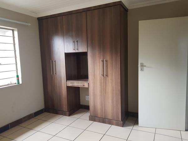 1st floor unit in secure complex offers open plan living area, closed patio with build in braai, kitchen with gas stove, 2 bedrooms fitted with build in cupboards and full bathroom