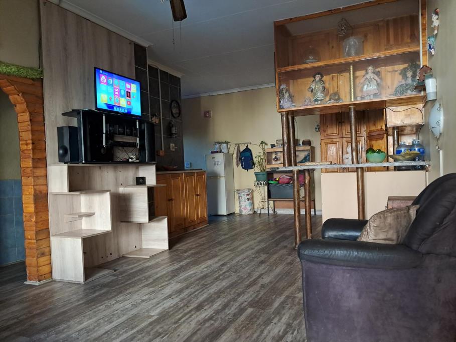 An open plan kitchen, dining room and lounge with tiled floors is spacious.