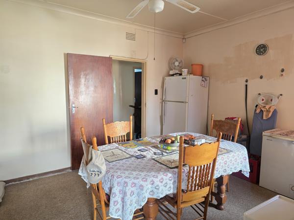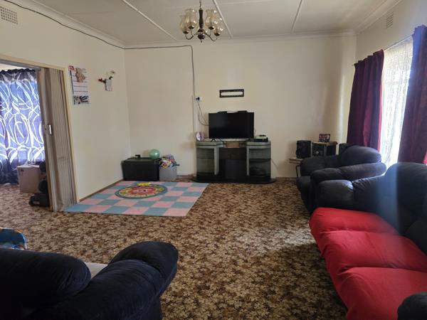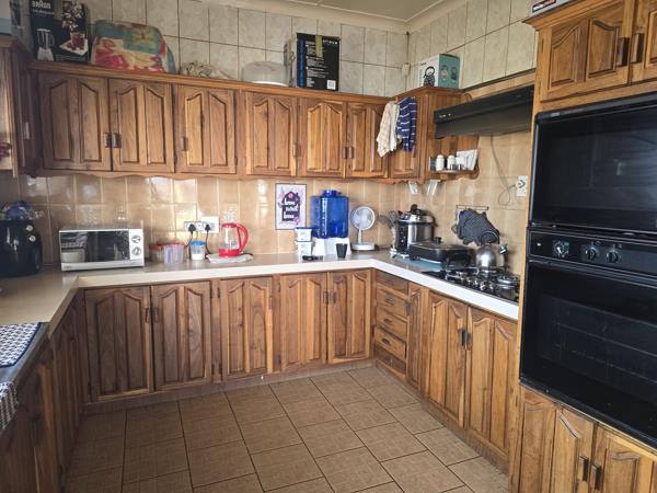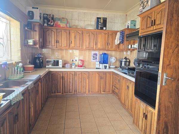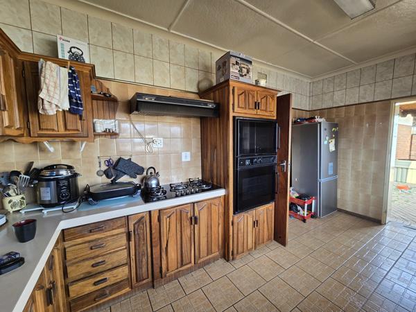 The home features a fully fitted kitchen equipped with built-in cupboards, a double sink, an eye-level oven, a gas stove, and blinds. Adjacent to the kitchen is a carpeted dining area, perfect for family meals. A versatile room can serve as a TV room, playroom, or home office, while the lounge opens directly onto the veranda, creating a warm and inviting atmosphere for relaxation or entertaining guests.