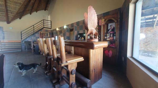 Open plan tv-dining area with a build in braai, bar and fire place, leading to a outside patio with a swimming pool and jacuzzi.