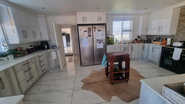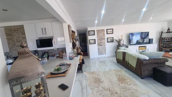 Living Areas: Modern kitchen with ample cupboards and workspace, beautifully tiled open-plan lounge and dining room with downlights.