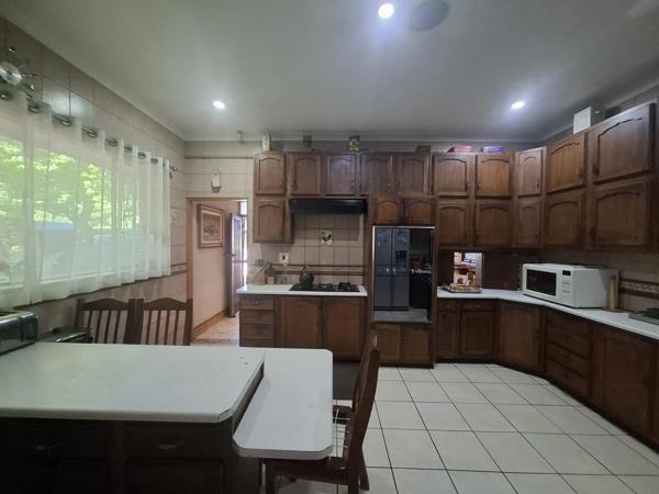 There are a formal living room, a dining room, a lounge, and three bathrooms in the five-bedroom house. Two of the bathrooms are en suite. The kitchen is spacious, featuring a gas stove, a breakfast nook, a scullery, and a dedicated laundry area. The expansive pool and tennis court are accessible from the entertainment room, which features a fireplace and bar.