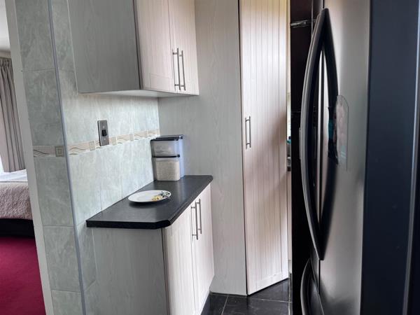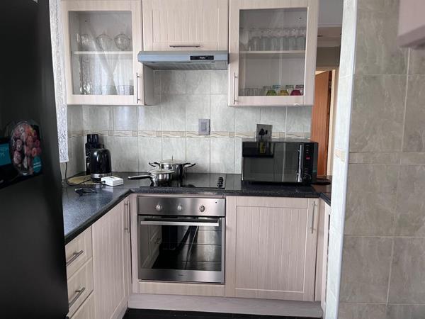 The modern fitted kitchen is a chefs delight: sleek light-wood cabinets, glossy black granite countertops, a built-in electric stove. Whether whipping up quick breakfasts or hosting braais, this space makes everyday living effortless.
