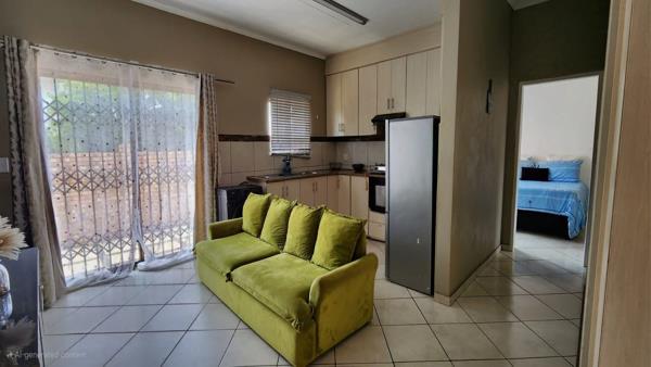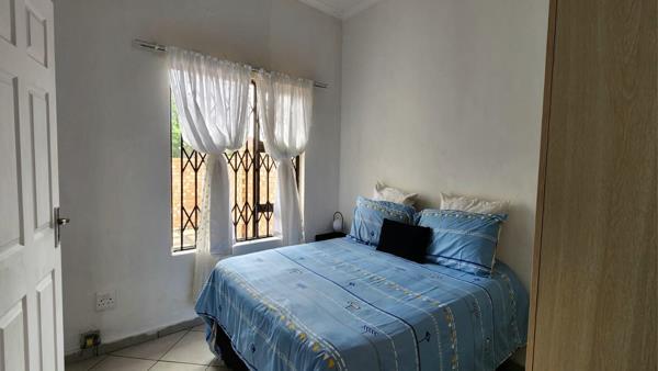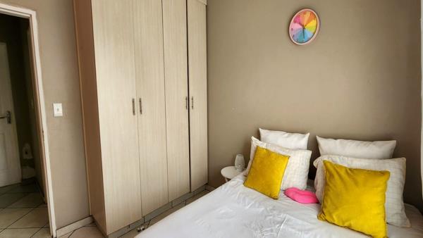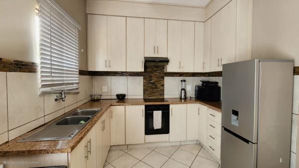 The home offers 3 bedrooms with built-in cupboards and 2 bathrooms, including a full en-suite in the main bedroom. The interior is tiled throughout, featuring an open-plan kitchen and living area that creates a welcoming flow. A sliding door in the living room (fitted with a safety gate) opens to a spacious, private courtyard that is fully paved for low maintenance.
