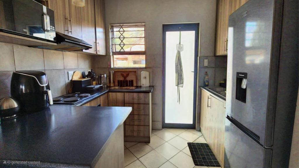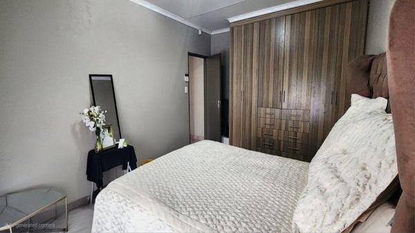 The townhouse is tiled throughout and finished with modern touches. The garage provides direct access to the house and includes built-in cupboards for extra storage. For added peace of mind, the property is fitted with an alarm system and burglar bars on all opening windows.
