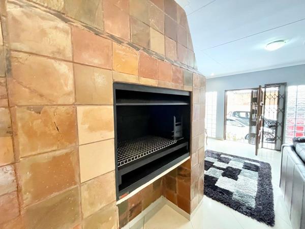 Indoor entertainement area which is totally tiled out with a built in braai, stacking doors which open up onto an outdoor patio area.