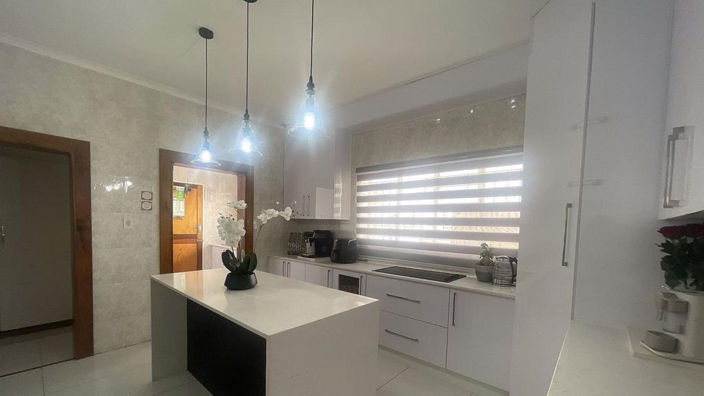 This spacious modern family home boasts a welcoming entrance hall leading into a comfortable lounge, dining room, and a cozy TV room equipped with a Jetmaster fireplace. The highlight of the home is the braai room with a built-in braai that seamlessly opens up to a beautiful garden and a sparkling swimming pool.