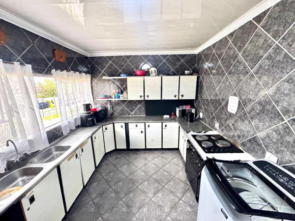 The interior boasts two generous living areas, both fully tiled for easy maintenance and a modern look. The kitchen is designed for functionality and style, featuring built in melamine cupboards, a four plate stove, under-counter oven, and wall to wall tiling. PVC ceilings in the kitchen add a sleek, contemporary touch while also being easy to clean.