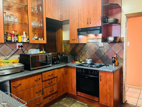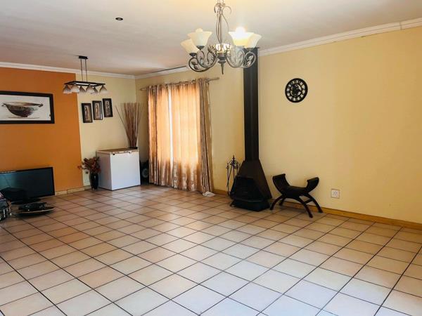 The first part of the house features a spacious open plan lounge and dining room with a fireplace and leads to the main kitchen. The house offers laminated flooring through out for extra warmth during chilly winters. The kitchen is equipped with melamine cupboards, electric hob and proceed to a laundry and scullery room at the back for extra convenience. The guest bedroom boasts of an en-suite bathroom while the other two bedrooms share one family room.