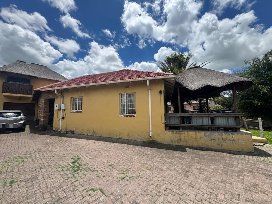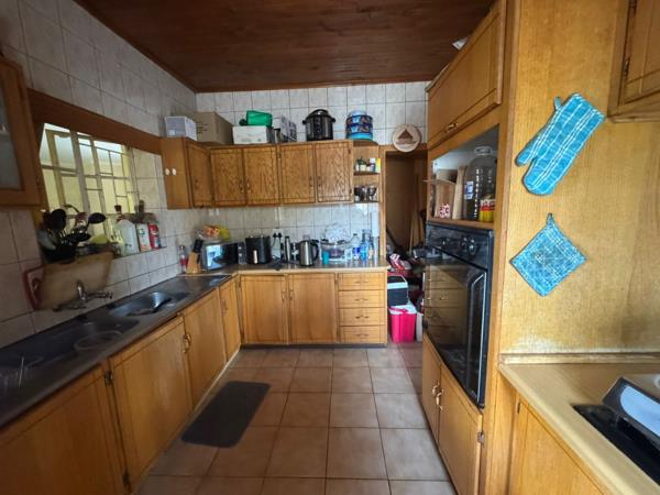This charming residential property, nestled in the established suburb of Evander, Secunda, offers a unique blend of comfort and outdoor living on a generous 793 sqm erf. The exterior features a distinctive yellow main house with a red tiled roof, complemented by a brick-paved driveway that provides ample parking and leads to a well-maintained garden. A prominent thatched outdoor entertainment area, complete with a lapa and deck, sets the stage for relaxed gatherings and al fresco dining, while a refreshing pool offers a private oasis amidst mature trees.