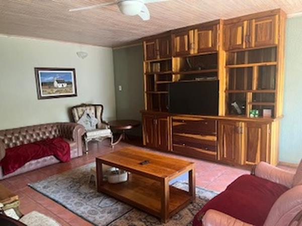 This spacious haven offers a warm welcome with an entrance hall leading to a carpeted lounge, a study, and a hobby room. It also boasts a guest toilet with a hand basin, an open-plan dining room equipped with a built-in gas braai and extractor fan, a stylish built-in bar, and a cozy TV room featuring a fireplace.