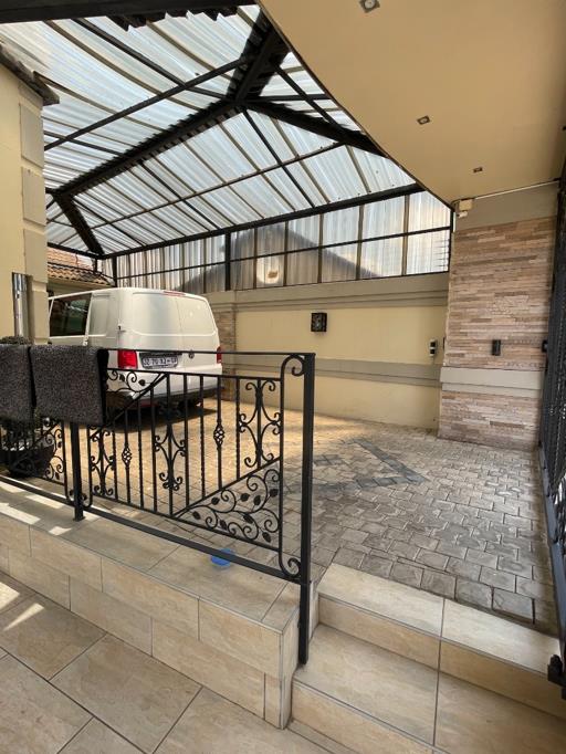 Beyond the interiors, the property features a dedicated gym, catering to a healthy lifestyle. Practical amenities include two garages and two additional parking spaces, ensuring ample vehicle accommodation. The 800 sqm erf is fully paved and totally walled, offering a neat and secure environment. Sustainability is addressed with water tanks and an irrigation system. Security is paramount, with electric fencing, an access gate, an alarm system, security gates, burglar bars, a security post, and CCTV surveillance providing comprehensive peace of mind.