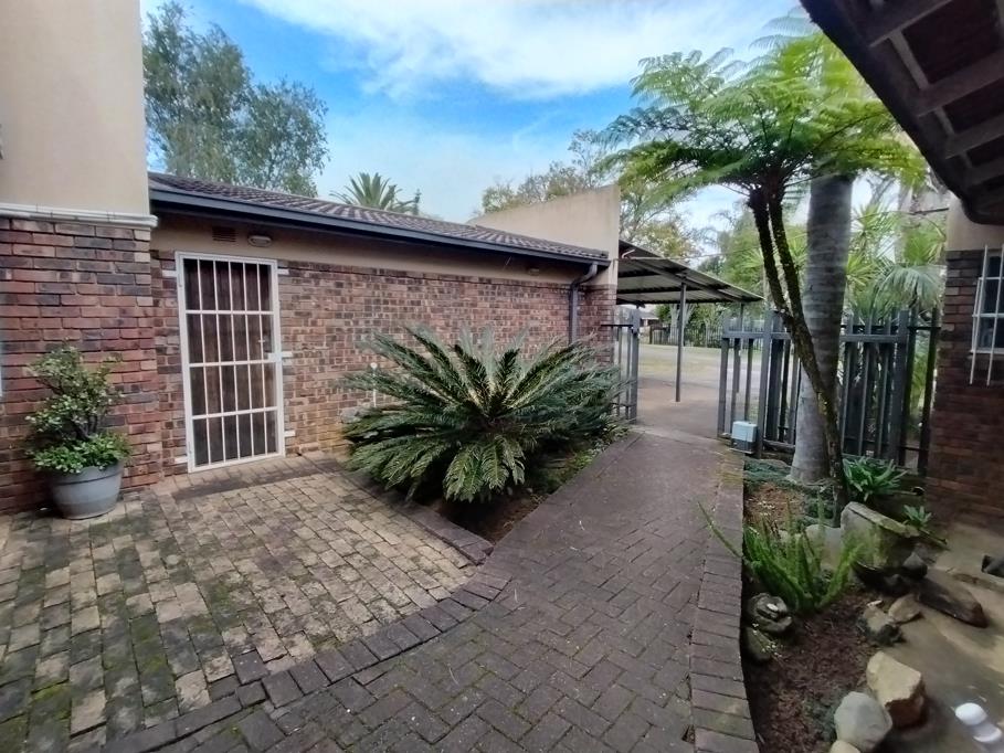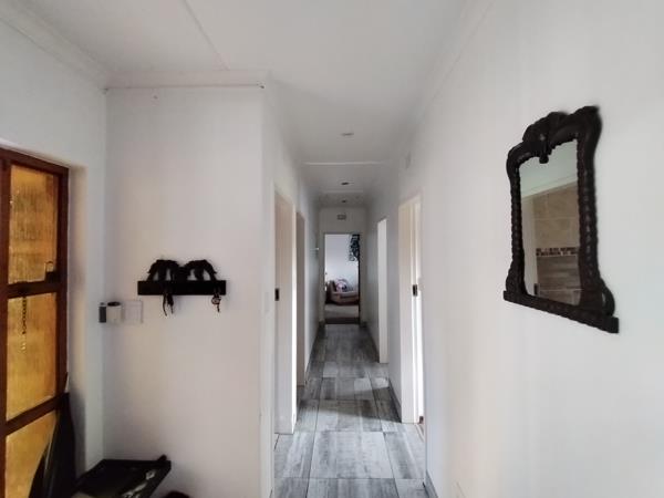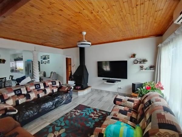 The inviting living area is equipped with a built-in fireplace and two air conditioning units, seamlessly extending to a generous patio space. The expansive patio includes a built-in braai, perfect for outdoor entertaining.
