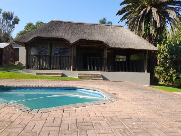 This beautiful, very neat property offers its new Owner 4 bedrooms and bathrooms. The main bedroom''s bathroom is en-suite with large shower and double basin. The living area is open plan to the modern kitchen with its wooden finishes and granite counters. The lounge also has a fireplace as an added bonus. There is also a large entertaining area with a built-in braai. Also, a thatched verandah (which we can be covered by canvas blinds) overlooking the beautiful garden and swimming pool. In addition there is also a 1 bedroom flatlet with its own carport and private entrance. There is also a pressure pump and a switch-over for your generator.