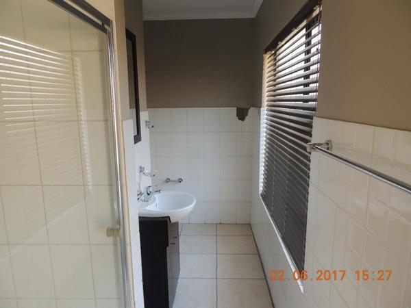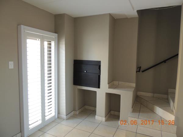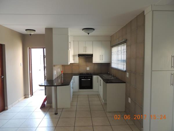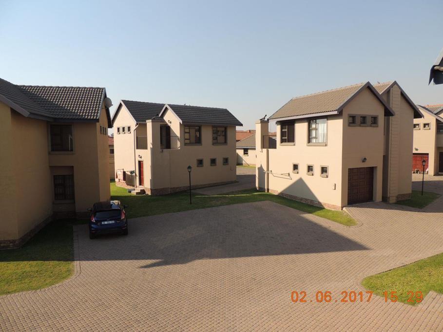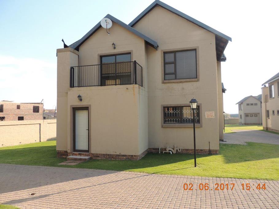 3 bedroom, full title, double story unit, in a secure complex in Secunda. Open plan kitchen / lounge on ground floor with build-in braai facility in lounge. Garage provides internal access to lounge. 2 Bedrooms with en-suite bathrooms and a separate third bathroom. Main bedroom with balcony. Prepaid electricity Tiled and carpeted flooring Alarm system installed Trellis door fitted Shutter blinds fitted to lounge windows Down lights fitted Blinds fitted Automated garage door Automated complex gate. View on appointment