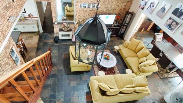 Open-Plan Living: Spacious lounge and dining area with double volume ceilings, beautiful naught pine accents, a stunning chandelier, and a cozy fireplace.