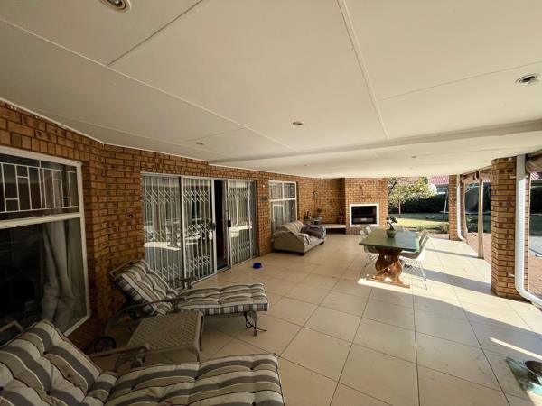 The covered patio, perfect for entertaining, overlooks the sparkling pool and features a built-in braai.