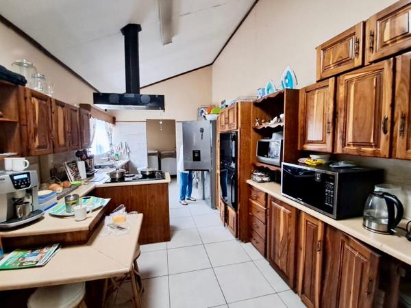 The kitchen is well-appointed with solid wooden cupboards, a four-plate electric stove, an extraction fan, and a double eye-level oven. There is also a scullery area equipped with all necessary connection points for your appliances, ensuring a seamless and functional cooking experience.