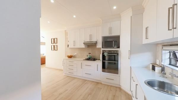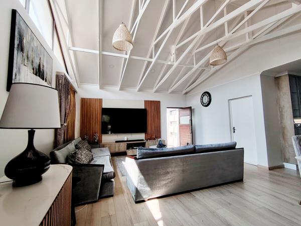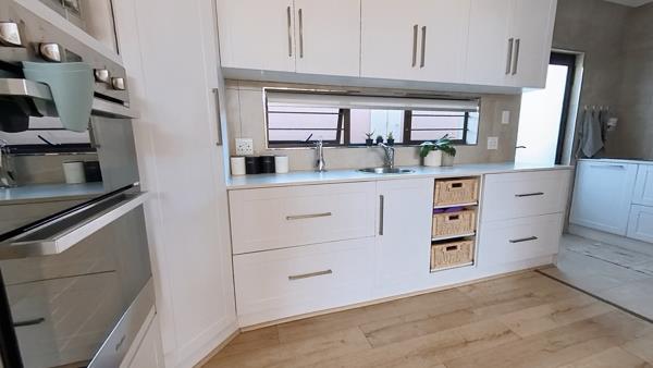 Beautiful and modern three bedroom townhouse in secure complex. Very modern open plan lounge, dining and kitchen area. Lots of cupboards provide ample storage and a scullery adds to the spaciousness. A modern gas hob with electric ovens will please any wife. The large bedrooms fit a double bed with ease. The bathroom in the passage boasts both shower and bath. The en-suite bathroom''s double shower is also luxurious. The small back yard is not only very private, but present a lovely entertainment option with the outside braai. A double garage with auto doors provide safe parking. Security includes an alarm, beams and cameras. Inverter, batteries and solar panels add value and ensure easy living throughout load shedding and water shortage. A comfortable, stylish setting - perfect as a starter home or downscaling.