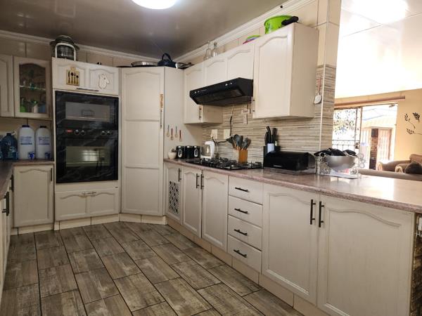 Situated on a spacious 1374m2 corner stand, this modern gem of a home offers both elegance and practicality. Upon entering, you are welcomed by a stunning white kitchen featuring a gas hob with an extractor fan and an eye-level oven, perfect for culinary enthusiasts. The open-plan lounge and dining room area are enhanced by a cozy fireplace in the lounge, creating a warm and inviting ambiance.