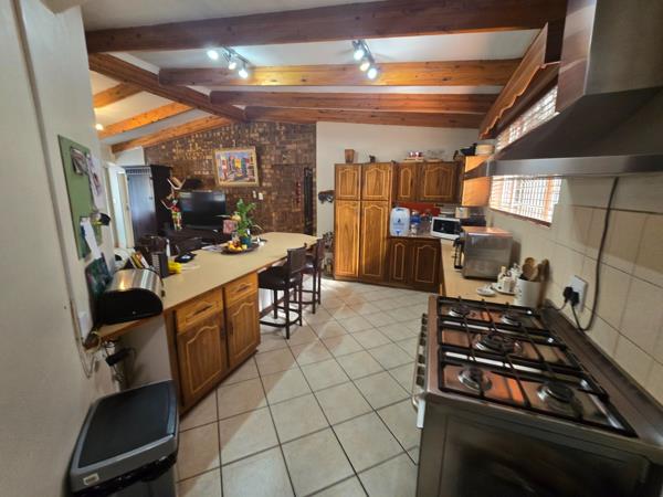 - Sparkling blue swimming pool, built-in braai, and working area with basin