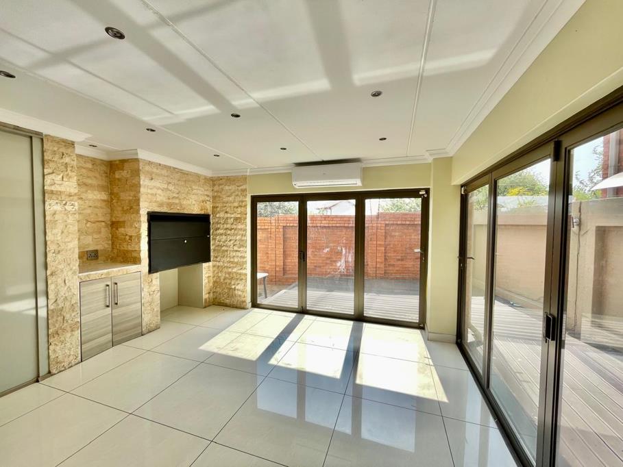 Open floor plan seamlessly connects the entertainment area, complete with a built-in braai, to a lovely wooden deck and a small private garden, perfect for hosting gatherings.