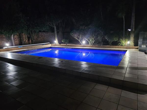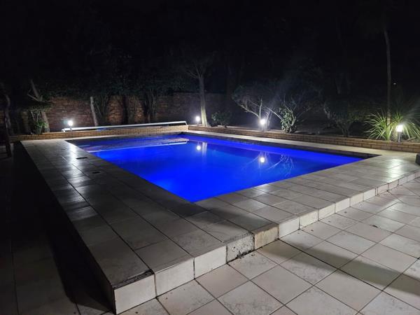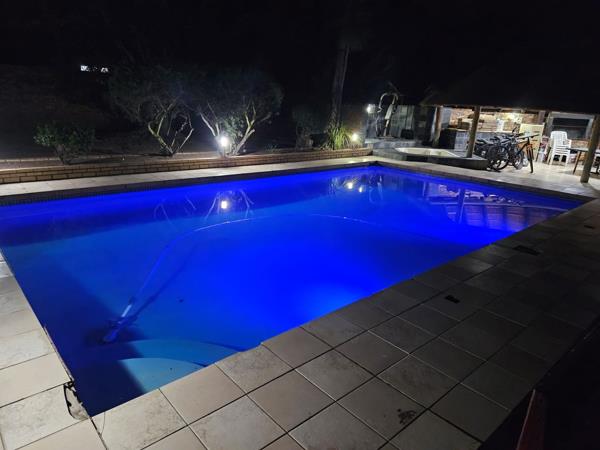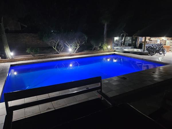 Entertainment Area: Gorgeous thatched outdoor space with built-in braai, jacuzzi, and a large pool for year-round enjoyment.