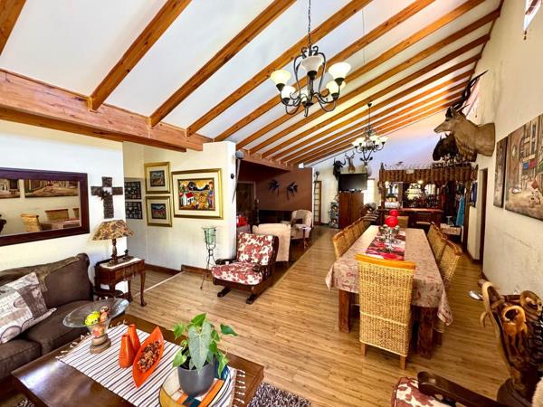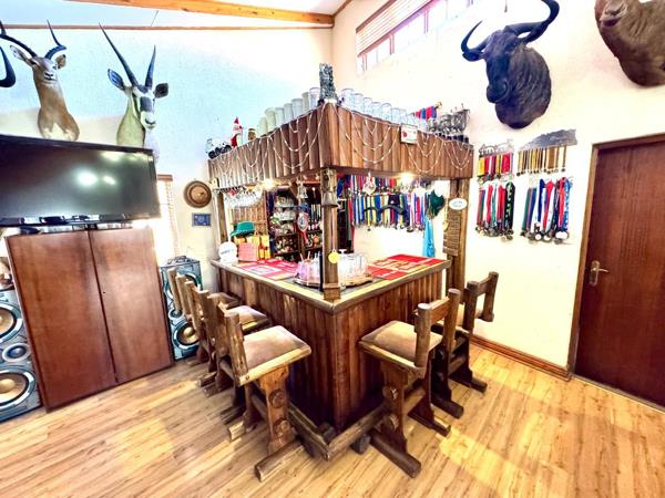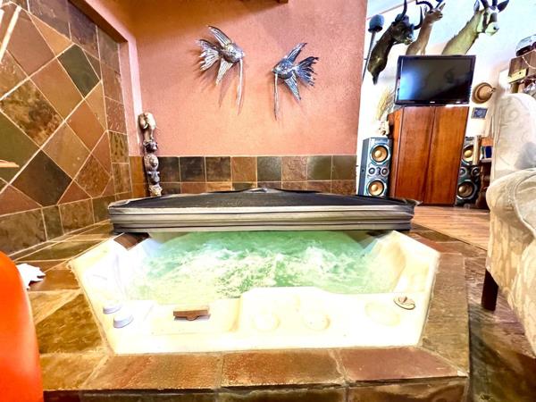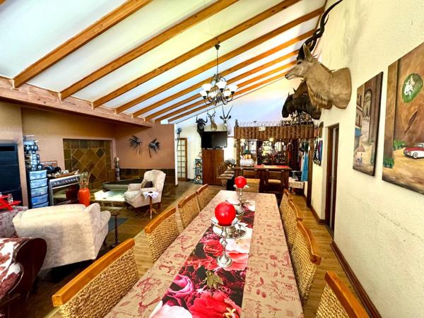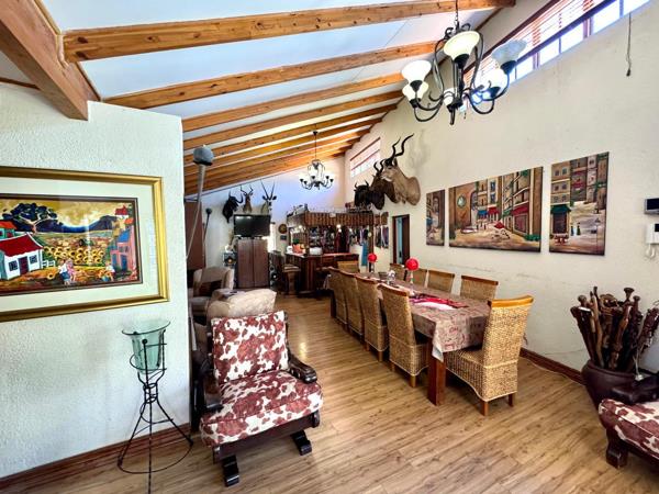 This stunning home welcomes you with an impressive entrance that leads directly into a spacious indoor entertainment area. Designed for relaxation and social gatherings, this space features raised ceilings, elegant tiling and laminated flooring, a built-in braai, a well-equipped bar, and a luxurious jacuzzi. The seamless flow of the design ensures that this area is perfect for hosting guests or enjoying quiet evenings with family.