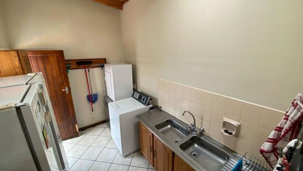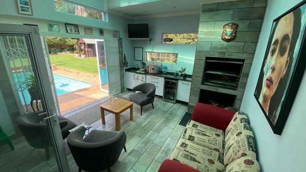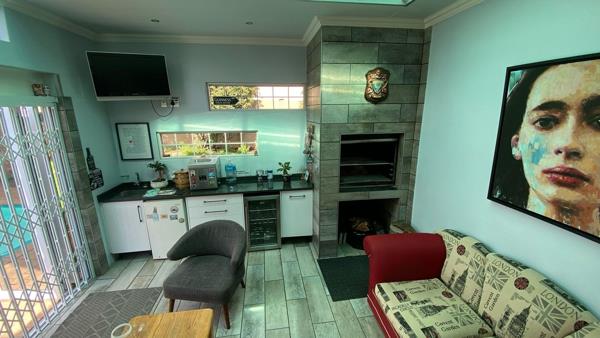 Designed for effortless entertainment, the home includes a built-in braai that flows onto a beautiful swimming pool and a lush garden. A covered patio offers the perfect setting for outdoor dining and relaxation, making it an ideal space for family and friends to enjoy.