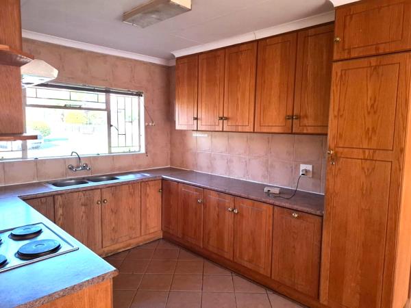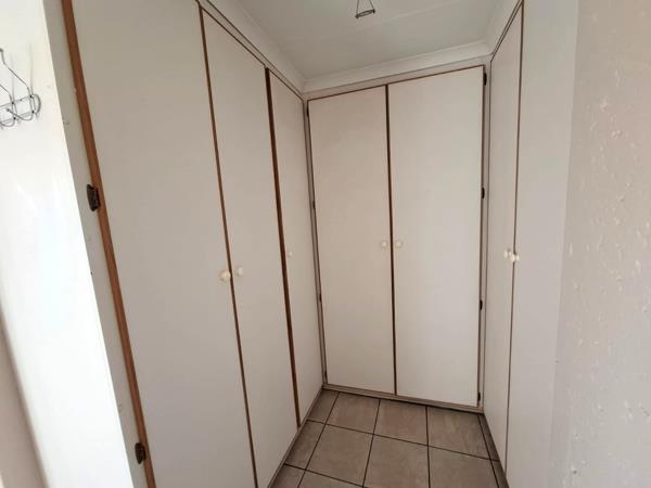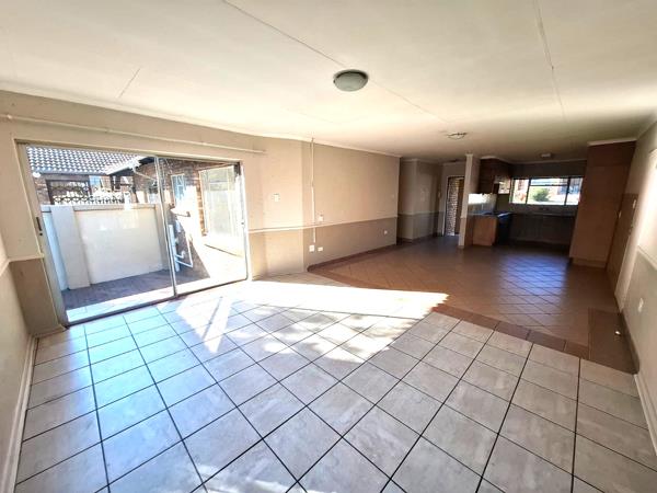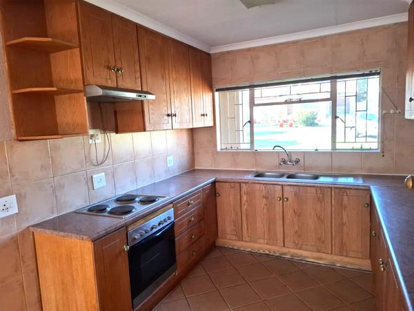 This full title townhouse is a freestanding house and situated in a very well managed complex. It welcomes you into a very spacious and sunny open plan lounge, dining area and kitchen. The lounge opens with a sliding door onto a private garden and patio area with build in braai. The kitchen has ample cupboards and an electric stove and extractor fan. You also get direct access to the single garage from the lounge.
