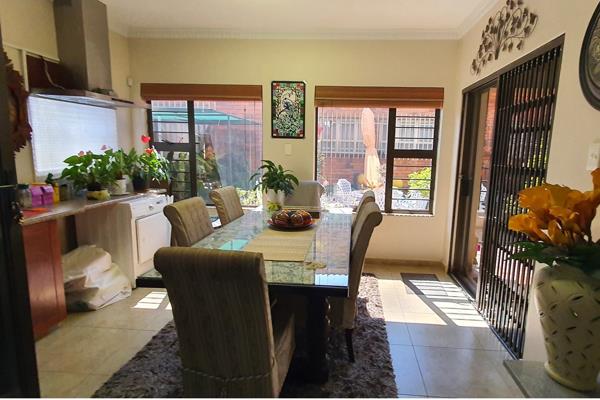 The main house features four spacious bedrooms, all with built-in cupboards, including a master suite complete with an en-suite bathroom. A second full bathroom is located off the hallway, which also offers ample built-in storage. The living spaces are thoughtfully arranged to balance comfort and sophistication, comprising a cosy lounge, a refined dining room, and a welcoming family room that opens to a covered patioperfect for relaxed gatherings. The kitchen is a standout, beautifully appointed with solid Saligna wood cabinetry, granite countertops, an eye-level oven, and a sleek electric glass-top hob. A separate laundry room adds practicality to this well-designed space. Outside, the property offers a large, manicured lawn, a Wendy house, and a covered entertainment area, ideal for hosting family and friends. Four garages, each with independent access, provide secure and ample parking.