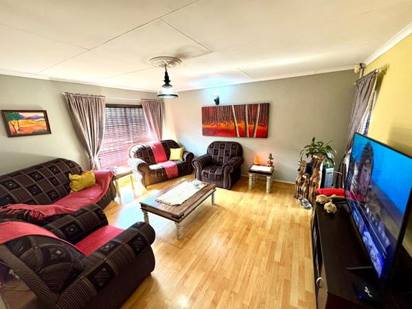 Upon entering through the front door, you are welcomed into a spacious main living area, complete with laminated flooring, blinds, and curtain railings, creating a modern and comfortable space. A second living areaideal as a dining roomalso features laminated flooring and flows easily into the kitchen.