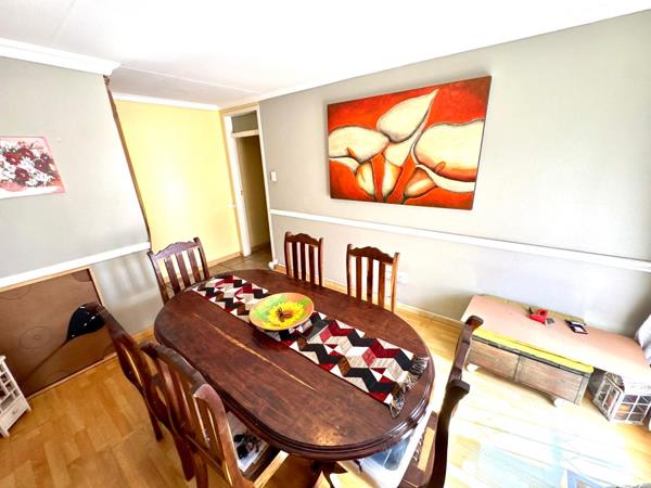 The home offers four well-sized bedrooms, each with built-in cupboards. Three of the bedrooms are fitted with laminated flooring, while the fourth features tiled flooring. One of the bedrooms boasts a sliding door that opens directly onto a patio area with a covered carport, offering privacy and easy outdoor access.