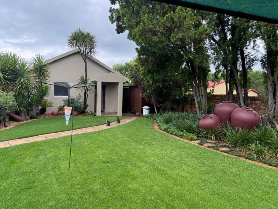 The kitchen, fitted with solid oak cupboards, flows seamlessly into the dining and family rooms, creating an open-plan space ideal for both family life and entertaining. The dining room opens onto another charming section of the garden, complete with a built-in braai, perfect for gatherings.