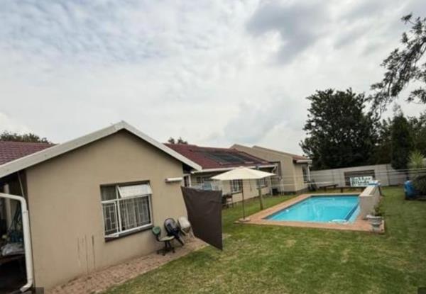 It offers 4 huge bedrooms, 3 tiled living areas,3 bedrooms including en-suite for main bedroom, kitchen with built cupboards, swimming pool, covered lapa, braai are, single garage and double carports.