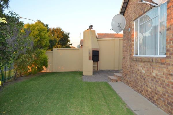 Are you looking for the a safe, spacious and well managed complex unit - then this is for you. It offers an open plan kitchen, dining area and lounge with big windows allowing light into the room, the lounge walks out on a private entertainment area with a built in braai. The house boasts a full bathroom with corner bath and shower plus an en-suite bathroom with a shower. The yard is very spacious - just look at the pics!! Its a great buy - well worth a view.