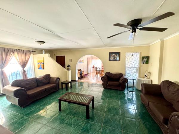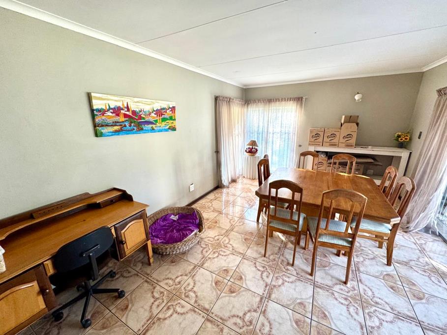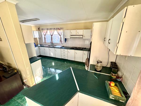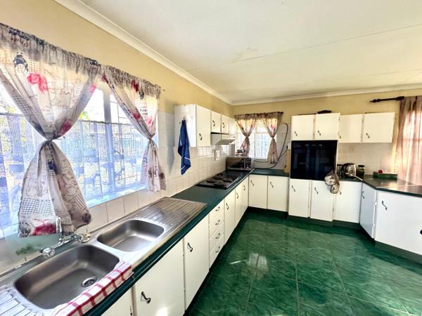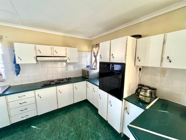 The house itself features a spacious and functional design. It boasts three generous living areas, one of which is semi open plan, creating a great flow and flexible space for entertaining or work-from-home setups. The open plan kitchen is well equipped with ample built in cupboards, generous counter space, an eye-level oven, and a four-plate electric stove with an extractor fan. A separate scullery adds additional convenience and storage.