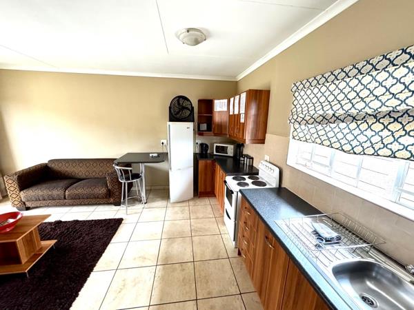 The interior features a spacious open-plan layout, seamlessly connecting the living area and kitchen to create a welcoming and functional space. The kitchen is fitted with modern melamine built-in cupboards, providing ample storage, and includes an electric stove and oven combination for easy cooking. The bedroom is well-sized and comes with built-in cupboards, offering plenty of storage space. The full bathroom is tastefully finished and includes both a shower and a bathtub, ensuring comfort and practicality.