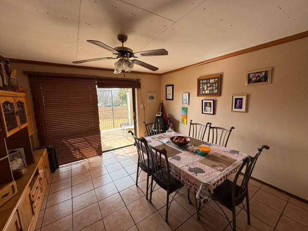 This strong and sturdy brickface home is set on a spacious corner stand, offering ample outdoor space and privacy. Upon entering the front door, you are welcomed into a cozy carpeted living area, perfect for relaxing or entertaining. Adjacent to this is a second, fully tiled living space featuring two sets of glass doors that open onto separate patio areas. One of the patios is equipped with a built-in braai, ideal for outdoor gatherings and weekend barbecues.