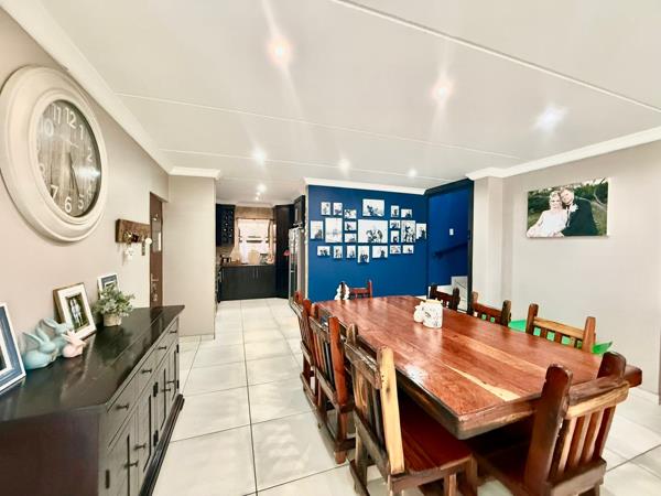 As you step through the front door, youre welcomed into an expansive living area, ideally suited as an entertainment space. This area features a built-in braai, making it the perfect spot for hosting guests or enjoying cosy family evenings all year round. From here, the home flows effortlessly into a spacious open-plan dining area and a modern kitchen, creating a central hub where family and friends can come together. The kitchen is well-appointed with granite countertops, a gas stove, melamine cupboards, and ample workspace combining practicality with sleek design. A conveniently located guest bathroom is also situated on the ground floor for added comfort and ease.