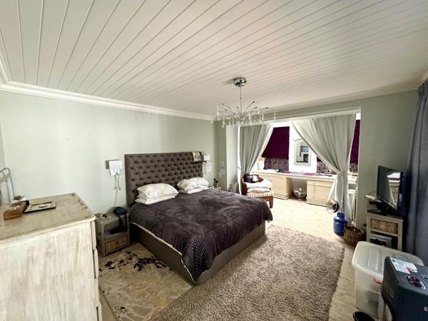 There are two bathrooms in total. The first includes a large shower, basin, and toilet. The master bedroom is generously sized and includes an additional skylight-lit space, an ensuite bathroom with a jacuzzi-style jet bath, basin, and toilet, and built-in cupboards with mirrored sliding doors. An enclosed patio with a built-in braai is accessible from both the living room and master bedroom, perfect for indoor-outdoor living.