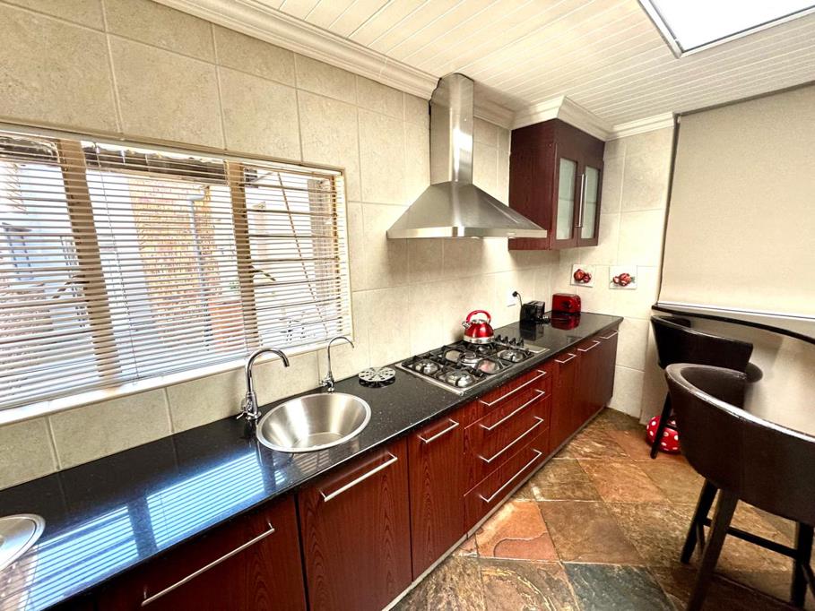 The spacious main residence features an open-plan living area with stylish slate tiles that flow seamlessly into a modern kitchen. The kitchen is equipped with granite countertops, melamine cupboards, a gas hob with extractor fan, an eye-level oven, a separate prepping basin, and a scullery with built-in cupboards. A study nook and guest bathroom add to the convenience.