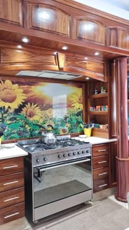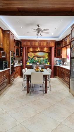 The large Cheff''s kitchen is fitted with ample Oak cupboards, Caesarstone work-tops, full gas stove, double eye-level electric ovens and a separate scullery housing all appliances.
